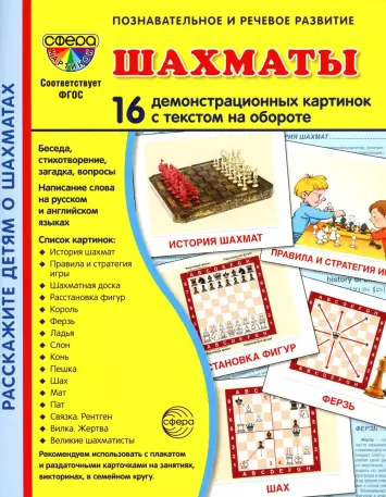 Издательство «ТЦ Сфера» представляет комплект серии «Сфера картинок» под названием «Шахматы». Он состоит из 16 цветных демонстрационных карточек (картинок) и адресован детям, желающим овладеть искусством шахматной игры. Дошкольники и младшие школьники узнают об истории этого интеллектуального вида спорта, выдающихся гроссмейстерах, ознакомятся с шахматными фигурами, терминологией, правилами и стратегией игры, тактическими приемами, изучат виды шаха, мата, пата и многое другое. На лицевой стороне каждой карточки дается цветное изображение, на обратной — подробное описание, из которого дети узнают немало интересного из мира шахмат. Для лучшего закрепления материала представлены оригинальные стихотворения и рифмованные загадки по теме, а также вопросы, на которые ребенок ответит после изучения материала или беседы со взрослым. Комплект подходит для индивидуальной и групповой работы, может использоваться на тематических вечерах и викторинах, посвященных шахматам.