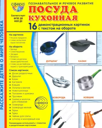 Авторы: Шорыгина Татьяна, Павлова О.В., «Посуда кухонная. Учебное издание (16 демонстрационных картинок с текстом)»: 16 демонстрационных картинок размером 173х220 мм для познавательного и речевого развития. На обороте каждой предметной картинки — описание, стихотворение, загадка, вопросы для ребёнка, название на русском и английском языках. Список картинок: Посуда для приготовления пищи и напитков: казан, кастрюля, ковшик, противни, сковорода, сковорода мелкая, турка, чайник для плиты. Кухонные принадлежности: доски разделочные, дуршлаг, лопатки и венчик, ножи кухонные, половник и шумовка, скалка и молоток для отбивания, тёрки, штопор и консервный нож.