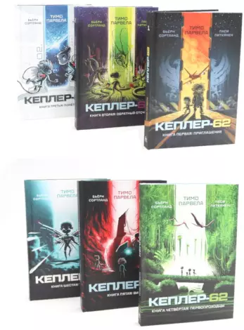 Комплект из 6 книг: «Кеплер-62. Книга первая: приглашение» Земной шар перенаселён, природные ресурсы стремительно истощаются. Тринадцатилетний Ари заботится о своем младшем брате Йони, пока их мама пытается найти хоть какую-нибудь работу. Мальчики вместе играют в новую компьютерную игру «Кеплер-62», которую никому не удаётся пройти до конца. Ходят слухи, что победителя, добравшегося до последнего уровня, ждёт какая-то особенная награда. Но никто не знает, какая. Да и правда ли, что это всего лишь игра? «Кеплер-62. Книга вторая: обратный отсчет» Мало кому удаётся преодолеть все уровни в компьютерной игре «Кеплер-62». Мари, дочь богатого промышленника, нанимает трёх геймеров, чтобы они помогли ей пройти игру до конца. Наградой за выигрыш оказывается участие в космической экспедиции. Загадочная организация OTNSPCFRVR собирается отправить подростков в космос, чтобы они исследовали планетную систему Кеплер-62. Но что будет, если отказаться от участия в этой миссии? Писатели Тимо Парвела и Бьёрн Сортланд с художником Паси Питкяненом создали захватывающий мир, где дружба проходит испытание в далёком космосе. «Обратный отсчёт» — вторая из шести книг серии. «Кеплер-62. Книга третья: полёт» Земля находится на краю гибели. Последняя надежда — космическая экспедиция на далекую планету Кеплер-62, куда отправляется команда специально подготовленных подростков. Что ждет их на пути длиной 1200 световых лет? Кто или что находится в дополнительной тринадцатой капсуле? И смогут ли очнувшиеся от гиперсна Ари и Мари предотвратить катастрофу? Писатели Тимо Парвела, Бьёрн Сортланд и художник Паси Питкянен создали захватывающую эпопею, где дружба проходит испытание в далёком космосе. «Кеплер-62. Книга четвёртая: первопроходцы» В четвертой книге экспедиция наконец прибывает на Кеплер-62е. Дивный зеленый мир, полный жизни, открывается перед путешественниками. Но их радость омрачена потерей четырех товарищей — один из кораблей не достиг цели. Кроме того, у Йони снова обострилась его болезнь. Мари и Ари, объединенные общей тайной, чувствуют себя в стороне от остальных. Им удается вступить в контакт с существами, обитающими на Кеплере-62е, но можно ли доверять этим существам? Писатели Тимо Парвела, Бьёрн Сортланд и художник Паси Питкянен создали захватывающую эпопею, где дружба проходит испытание в далёком космосе. «Кеплер-62. Книга пятая: вирус» Природа на новой планете таит для много сюрпризов. Ари и Мари обнаруживают закодированное сообщение, отправленное странным космическим зондом. Кроме того они замечают, что кое-кто из участников экспедиции знает гораздо больше остальных. Писатели Тимо Парвела, Бьёрн Сортланд и художник Паси Питкянен создали захватывающую эпопею, где дружба проходит испытание в далёком космосе. «Кеплер-62. Книга шестая: тайна» Участников экспедиции охватывает паника. Склад с оружием пуст, а противоядие исчезло. За всем стоит таинственный обитатель лишней капсулы, а его личность оказывается неожиданностью для всех. В чем цель миссии «Kepler-62»? Секреты раскрываются один за другим. Писатели Тимо Парвела, Бьёрн Сортланд и художник Паси Питкянен создали захватывающую эпопею, где дружба проходит испытание в далёком космосе. Товар бережно упакован в пупырчатую плёнку и картонную коробку для защиты от механичес
