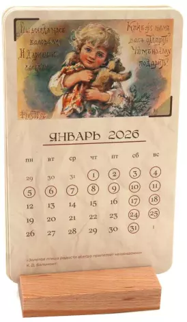 Настольный календарь «Добрые традиции» — не просто способ отсчитывать дни. Это окошко в уютный и добрый мир, где время движется размеренно и неторопливо, а человек успевает радоваться самому простому и самому важному. 12 месяцев — 12 старинных художественных открыток, созданных мастерами графики начала XX века. Эти трогательные, милые и немного наивные образы, дополненные словами Толстого, Достоевского, Чехова, Пришвина, Бальмонта и других классиков, станут источником вдохновения, поводом улыбнуться и просто подарком для глаз на весь год. А ещё теперь это настоящие «Добрые традиции»! Ведь календарь на 2026 год — это вторая глава нашей календарный истории. Мы сохранили всё, что вам понравилось в «Добрых традициях» — 2025: — 6 двусторонних карточек: удобно и стильно. — бархатистая поверхность «софт-тач», приятная на ощупь и создающая эффект дорогой старинной бумаги. — добротная подставка из массива бука, которая прослужит долгие годы. Но в нем всё новое! Мы подготовили для вас совершенно новую подборку редких дореволюционных открыток и небанальных цитат русских писателей. Даже фон карточек выполнен в новом тёплом оттенке, который будет отлично смотреться и на рабочем столе, и в книжном шкафу на фоне переплётов с любимыми фамилиями, и на кухонной полочке. Такой календарь — не только симпатичный аксессуар в винтажном стиле, это знак уважения, нежности и общих ценностей.