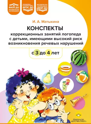 Автор: Матыкина И.А., «Конспекты коррекционных занятий логопеда с детьми, имеющими высокий риск возникновения речевых нарушений (с 3 до 4 лет)»: