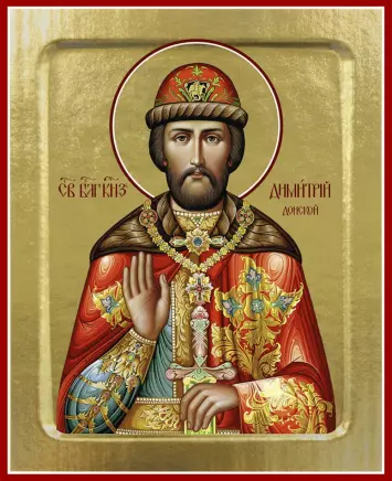 Икона Димитрия Донского, благоверного князя на дереве. Техника изготовления: заготовка из липовой доски обрабатывается вручную, глубина ковчега 1,5-2,0 мм. После нанесения подготовительного грунта заготовка покрывается поталью (имитация сусального золота). Изображение иконы наносится современной светоотражаемой пигментной краской и защищается лаковым покрытием.