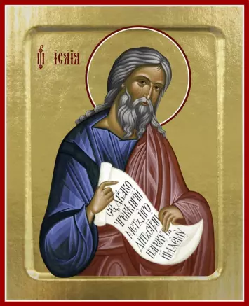 Икона Исайи, пророка на дереве. Техника изготовления: заготовка из липовой доски обрабатывается вручную, глубина ковчега 1,5-2,0 мм. После нанесения подготовительного грунта заготовка покрывается поталью (имитация сусального золота). Изображение иконы наносится современной светоотражаемой пигментной краской и защищается лаковым покрытием.