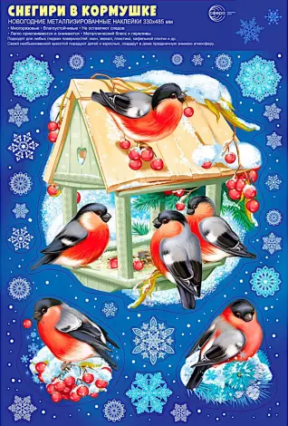 • Новогодние наклейки А3+ в пакете. Снегири в кормушке (серебряная металлизация, многоразовые)